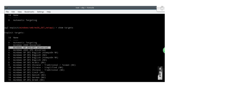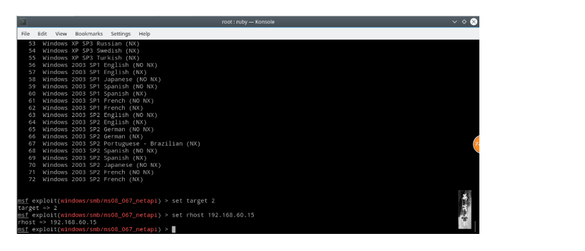 从中可以看出目标IP已经设置好接着设置Exploit target,使用show targets 查看可选项可以看出以下版本的系统均存在此漏洞