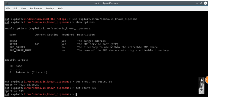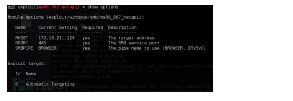 从图中可以看到还需设置RHOST(目标地址)、Exploit target(攻击目标)使用 set 命令设置 Module Options,此处需要设置目标IP即 set RHOST 172.16.211.129