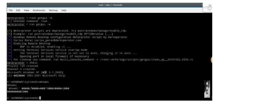 在meterpreter中输入run getgui -e 命令,可以打开RDP(远程桌面)服务,端口号3389。