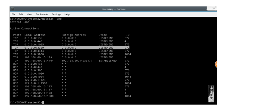 使用netstat -an命令查看端口是否开放,从图中可以看到已经开放3389端口。