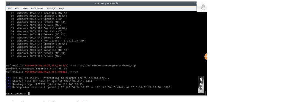 执行exploit命令后得到一个meterpreter命令行交互窗口