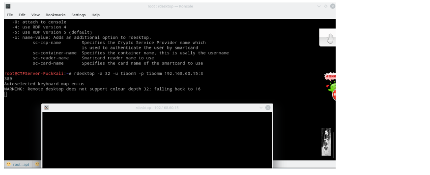rdesktop -a 32 -u gao -p 123 172.16.211.129:3389