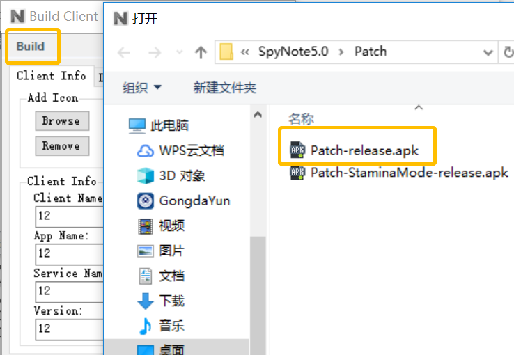 (4)最后点击Build按钮,在选择框中选择和spynote同处在一个文件夹中Patch-release.apk。