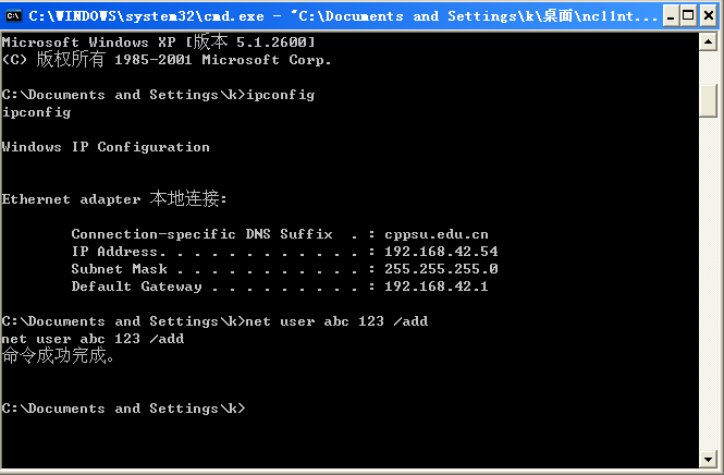 在shell中,利用net user 用户名 密码 /add ,添加一个用户,并在受害者的机器中使用 net user 命令进行验证。(需要截图)