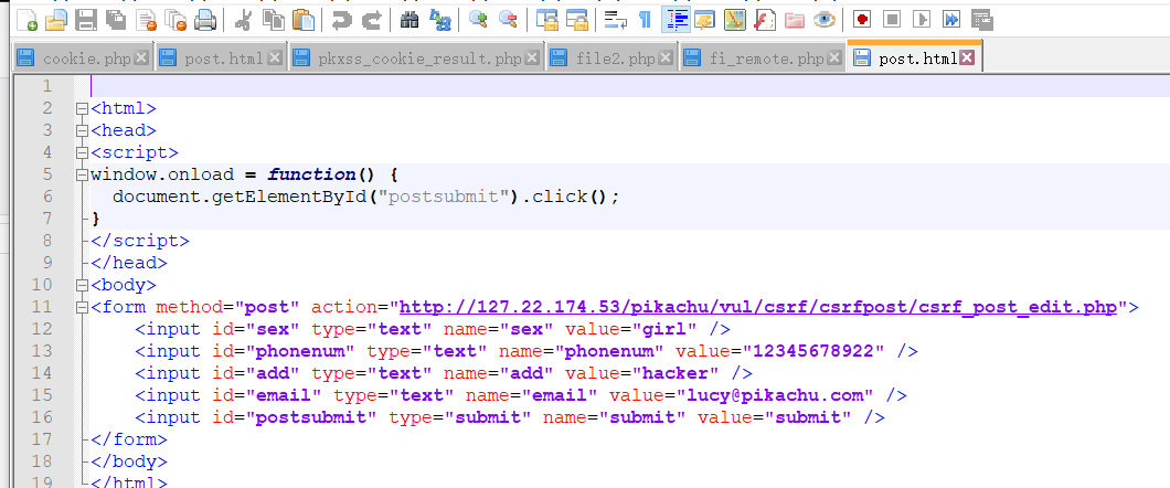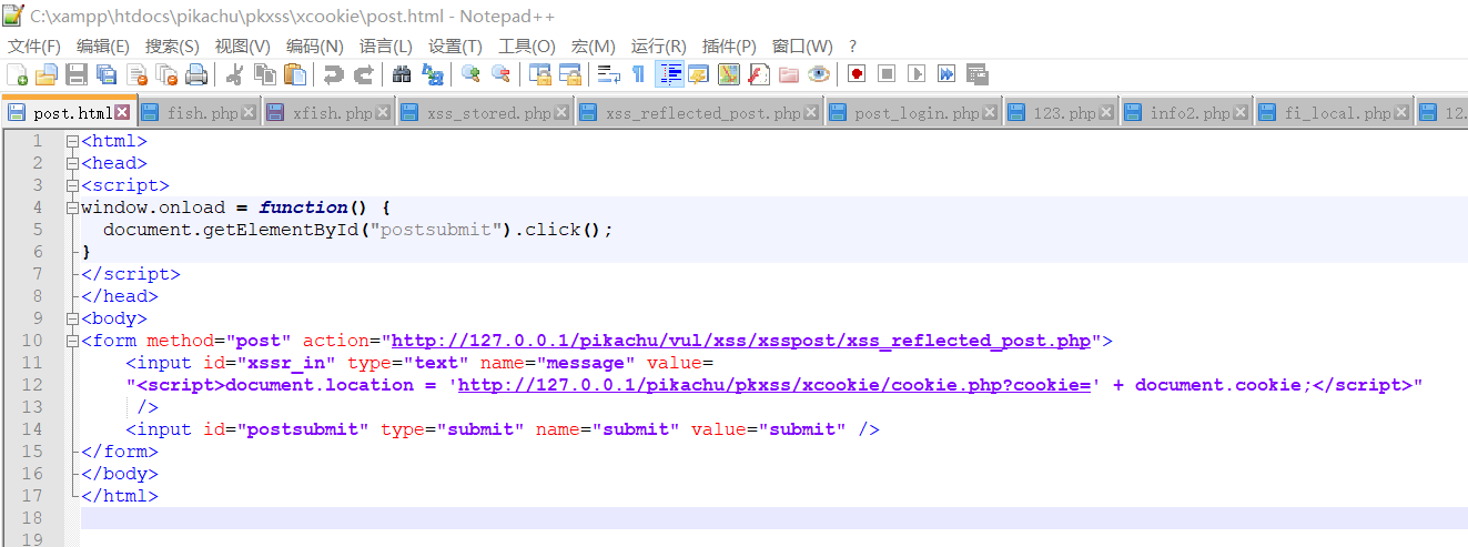 接下来修改post.html,诱使被攻击者点击链接,访问该页面,进而触发自动提交表单,获取其cookie。