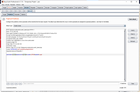 通过服务器多次发回的响应“username or password is not exists~"判断,这个验证码不具备时效性,后台不会在一段时间内刷新验证重新进行校验,同一个验证码同样具有有效性。那么就可以使用之前的方法来进行暴力破解。将POST请求发送到Intruder模块下。点击Clear清除变量,再将账户和密码设置为变量,同时将验证码填为正确的验证码。