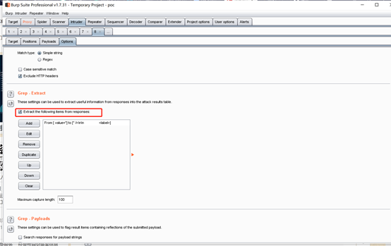 在options中的grep-extract中打勾点击add添加过滤条件,点击refetch response找到响应包中的token 选中复制token值点击确定。