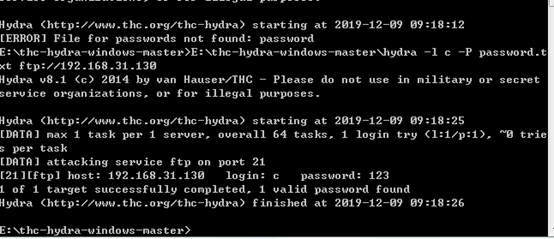 2.B同学使用hydra 对ftp用户的密码进行字典破解。hydra 中有关于该软件的使用命令语法。字典文件需要自己去生成。