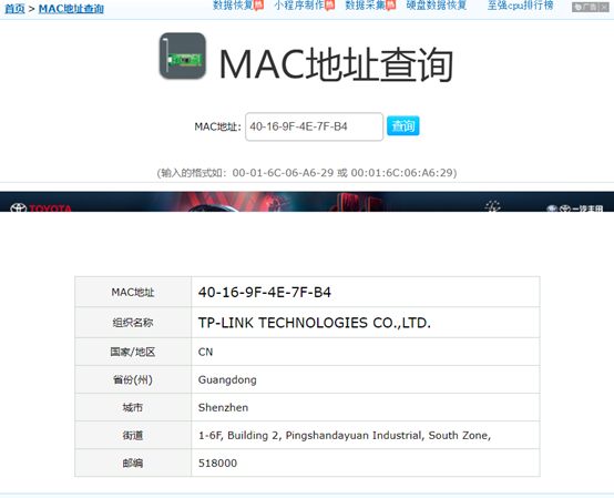 在一个案件中,获取了犯罪嫌疑人的一个MAC地址:40-16-9F-4E-7F-B4,请查询该MAC地址对应的厂商是(附截图)