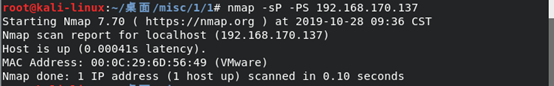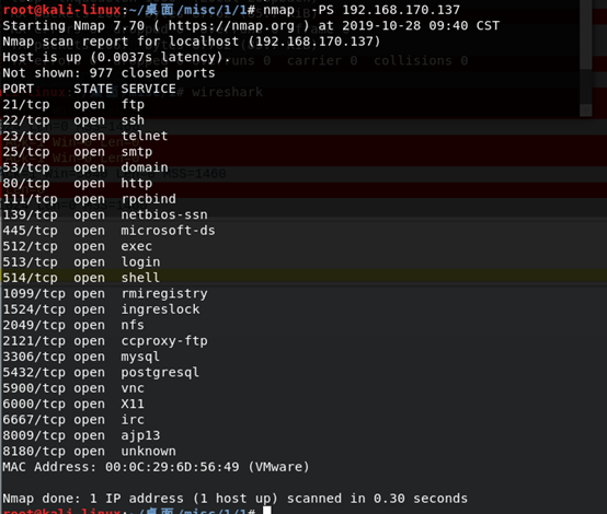 选择一个存活IP地址,扫描所开放的端口(分别用ping扫描,syn扫描尝试),并查询常用端口所对应的服务及操作系统信息。