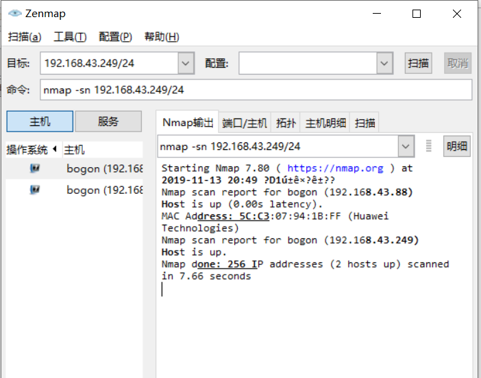 请查询本机的IP地址和子网掩码,并在局域网中扫描本网段内的所有存活主机(附搜索截图)