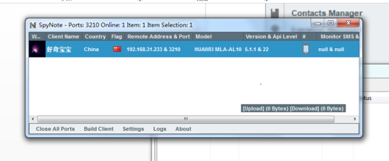 可以在spynote中看到有一台机器上线,并可以查看其基本信息。