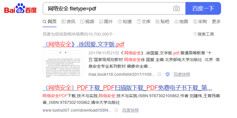 用百度或google搜索所有包含“网络安全”的pdf文档(附截图)