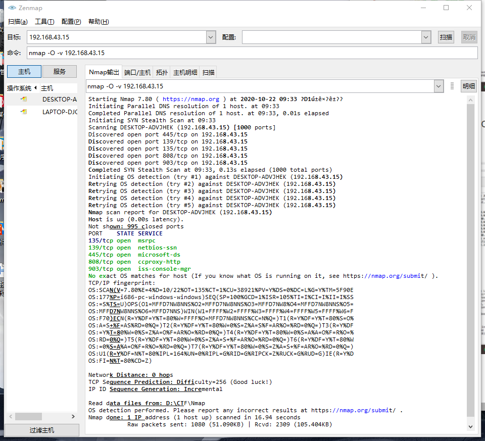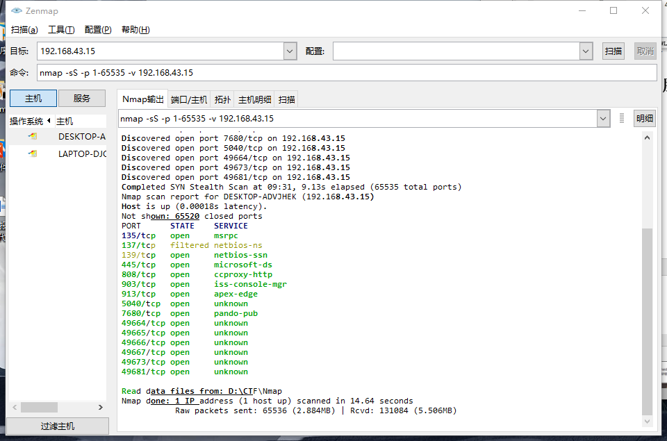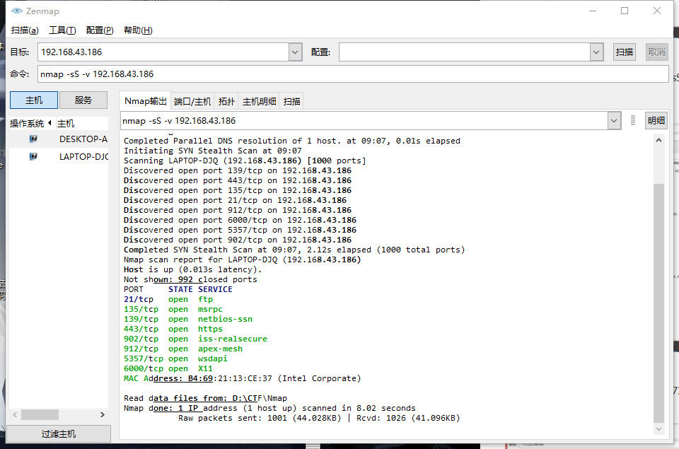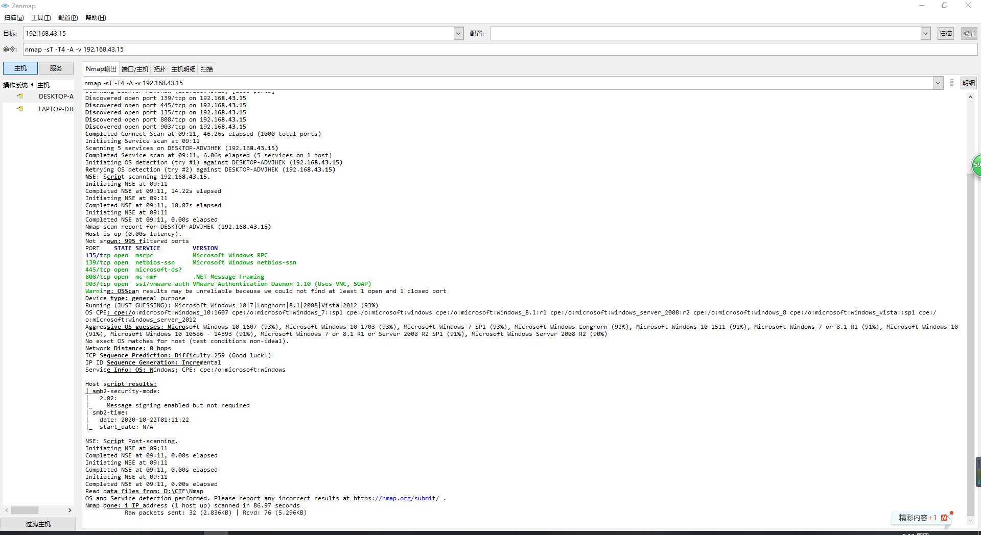 选择一个存活IP地址,扫描所开放的端口(分别用ping扫描,syn扫描尝试和全连接扫描),并查询常用端口所对应的服务及操作系统信息。