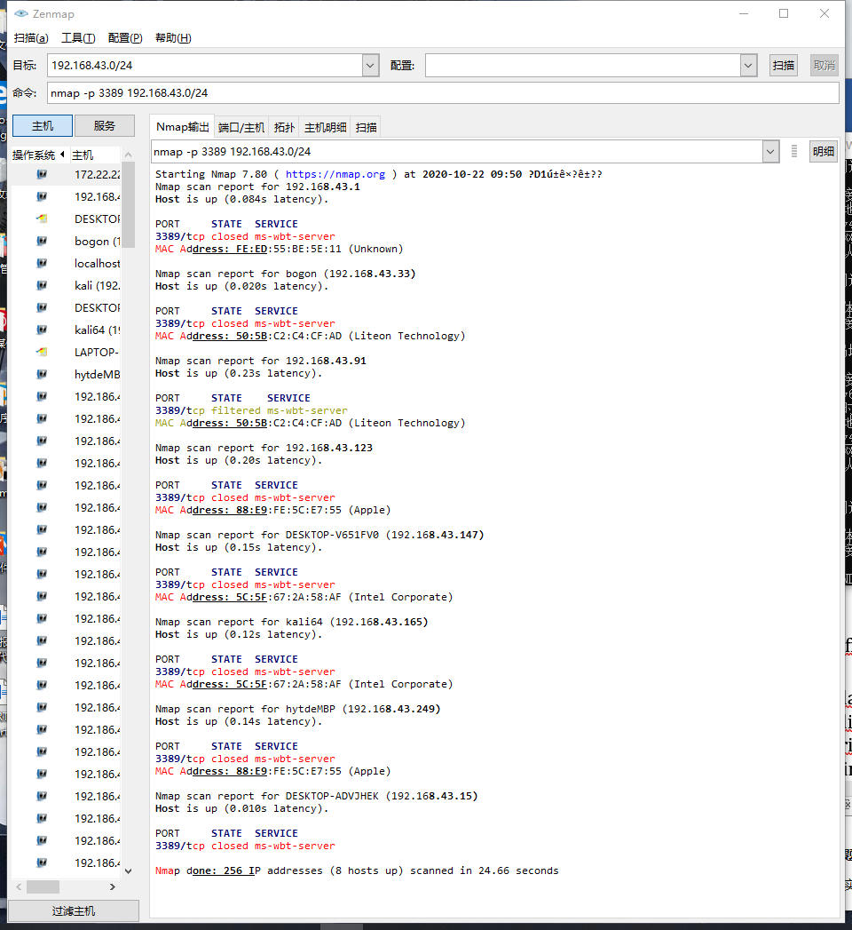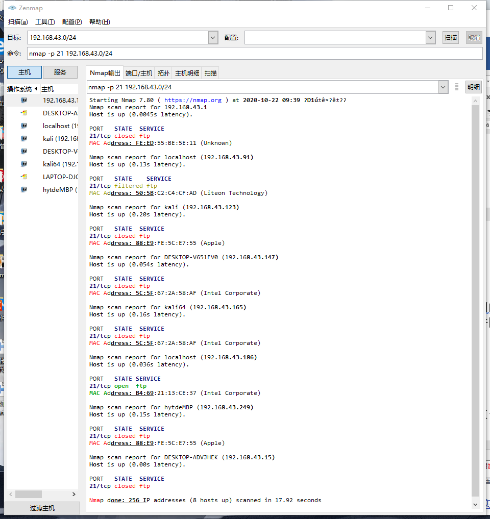 在实验楼上网的局域网内,请扫描出来,哪些机器开启了ftp服务,哪些机器开启了远程桌面连接服务,并附截图证明。