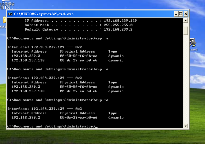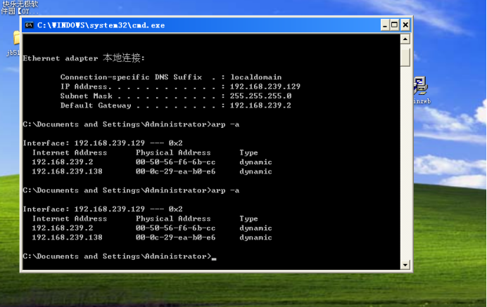 ARP欺骗前 192.168.238.129机正常缓存表和IP地址
