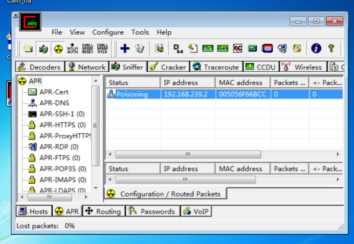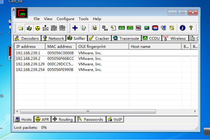 2、在A虚拟机上运行cain,选择要嗅探的网卡(单网卡,默认就可以),点选工具栏中的网卡图标,之后选择sniffer页,再选择左下角的hosts,右键选择“scan MAC address”,扫描局域网中的活动主机IP及MAC地址