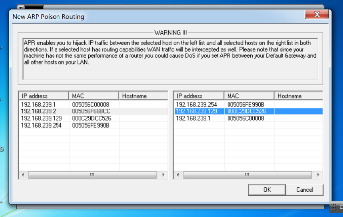 3、选中ARP页-》点下列表栏空白处,大加号变为可选-》点大加号,在弹出的窗口中选择要嗅探的目标主机(注意这里的选择和单击欺骗嗅探不一样,左面直接点网关,其它机器自动出现在右侧列表中,这时需要按住ctrl键在右侧选择你需要嗅探的主机,点oK按钮,回到软件主窗体,如图所示