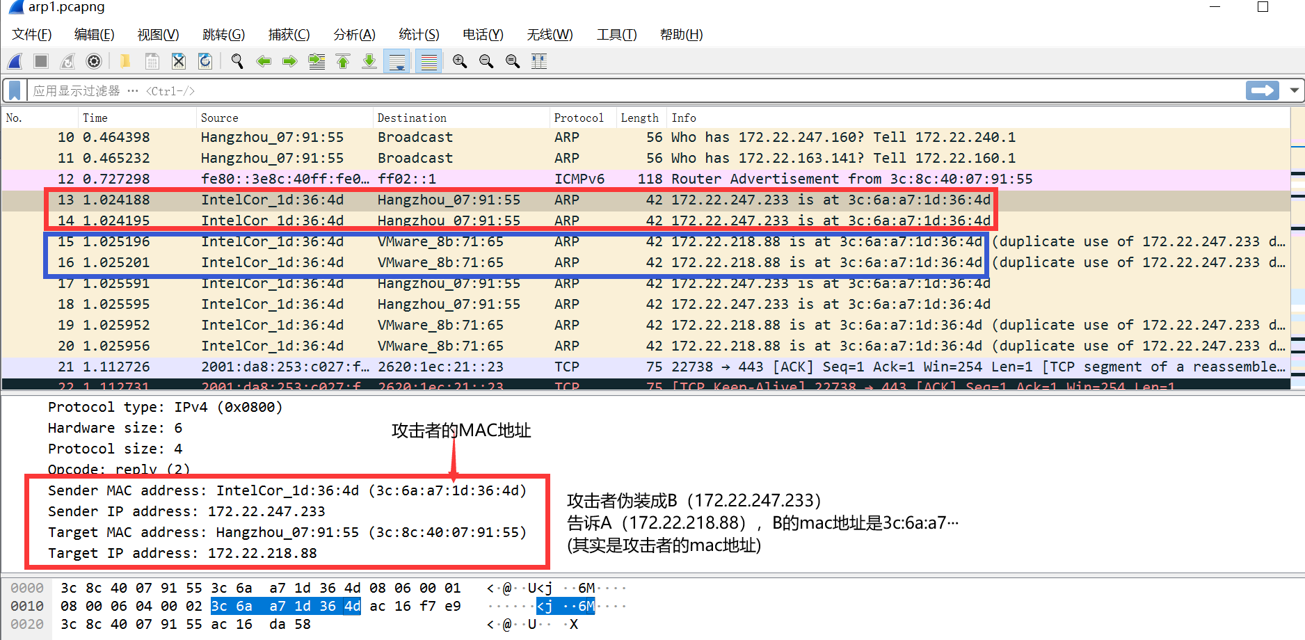 3.欺骗过程中,在主机A开启Wireshark进行抓包,分析APR欺骗攻击过程中的数据包特点。(附截图)