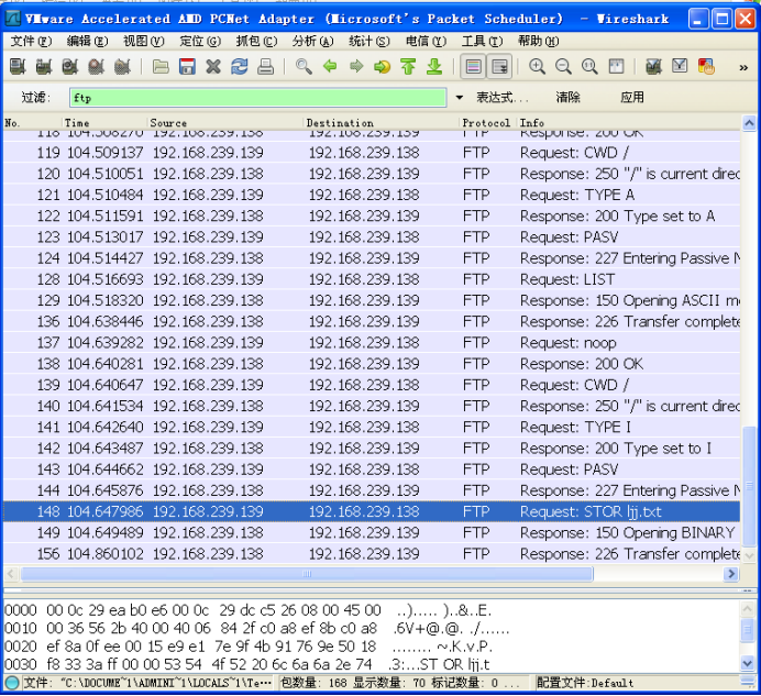 3.B同学在机器中安装Wireshark,并将其打开;之后用用户名和密码登陆A同学的FTP服务器,并上传一张图片。