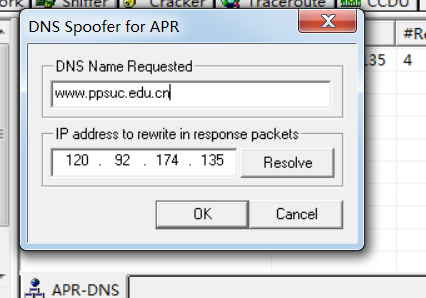 3.B同学扮演攻击者,设计攻击方法,使用CAIN,通过DNS欺骗的方式,让A同学访问www.ppsuc.edu.cn网址的时候,访问到另外一台机器上的伪造网站