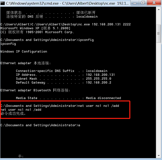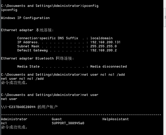 在shell中,利用net user 用户名 密码 /add ,添加一个用户,并在受害者的机器中使用 net user 命令进行验证。(需要截图)