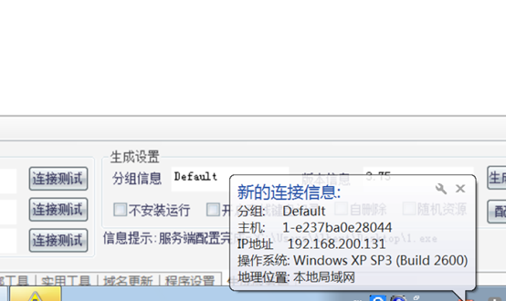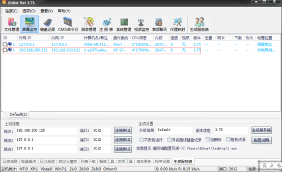 点击菜单栏中的“服务生成”,在弹出的配置服务端中,配置回连IP地址(攻击者IP)和端口号,并点击“生成”按钮,生成木马服务端。