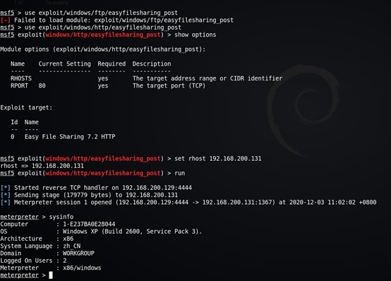 5.进入到meterpreter> 命令行下,说明已经获取到shell,可以使用sysinfo查看目标系统的信息,screenshot截屏。