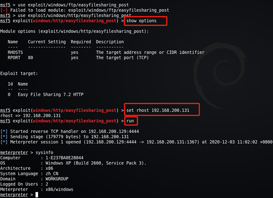 4.把远程目标参数rhosts设置为主机A的IP地址,开始攻击。