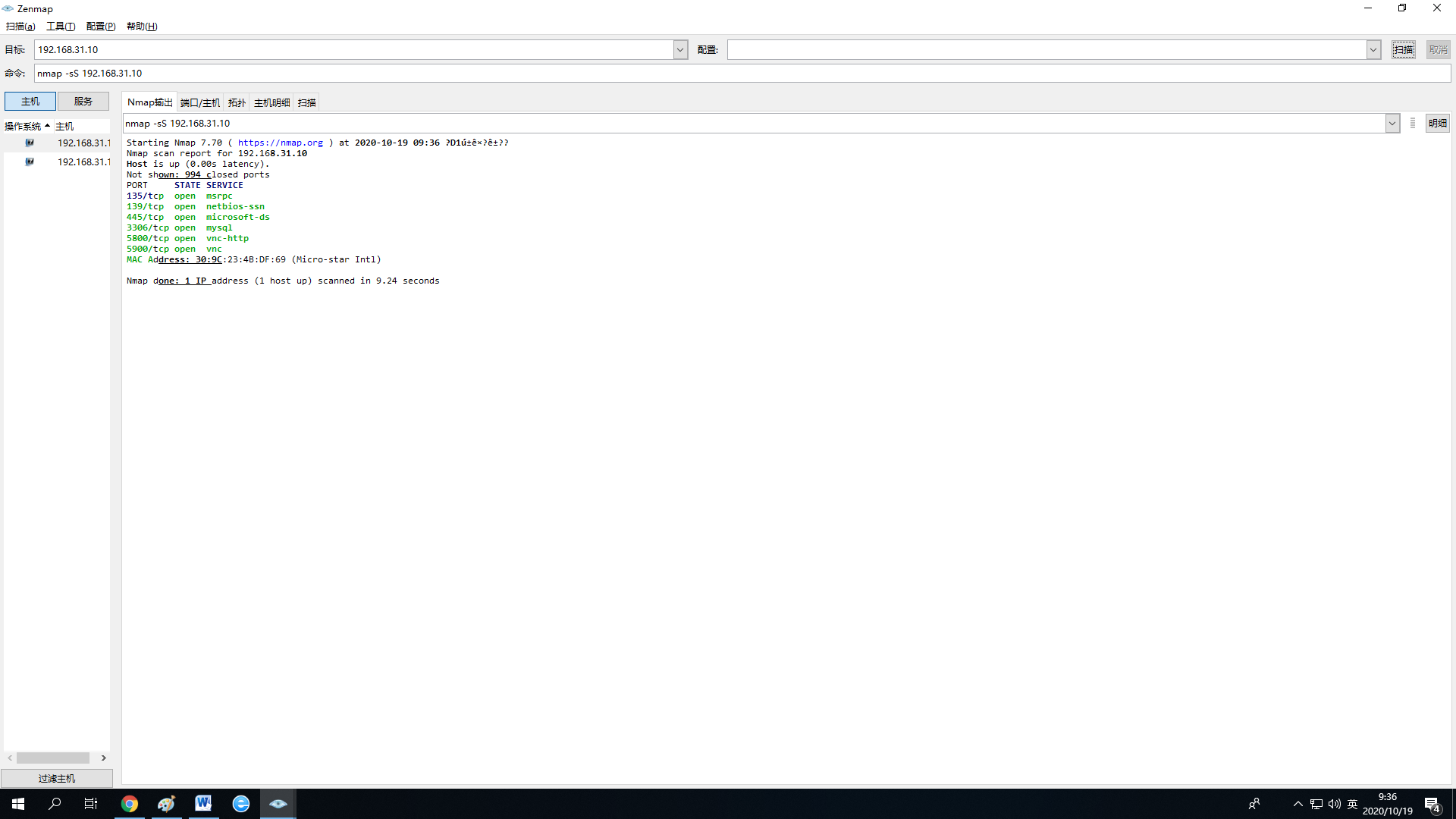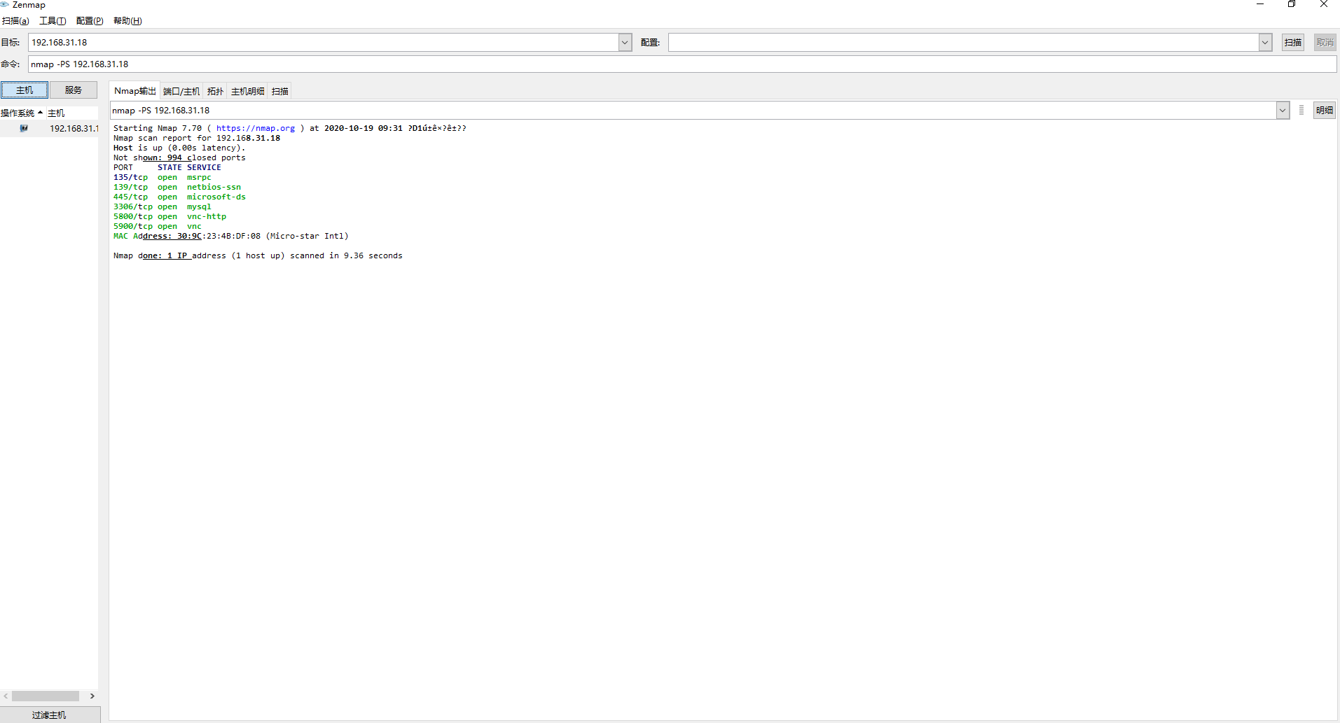 选择一个存活IP地址,扫描所开放的端口(分别用ping扫描,syn扫描尝试),并查询常用端口所对应的服务及操作系统信息。