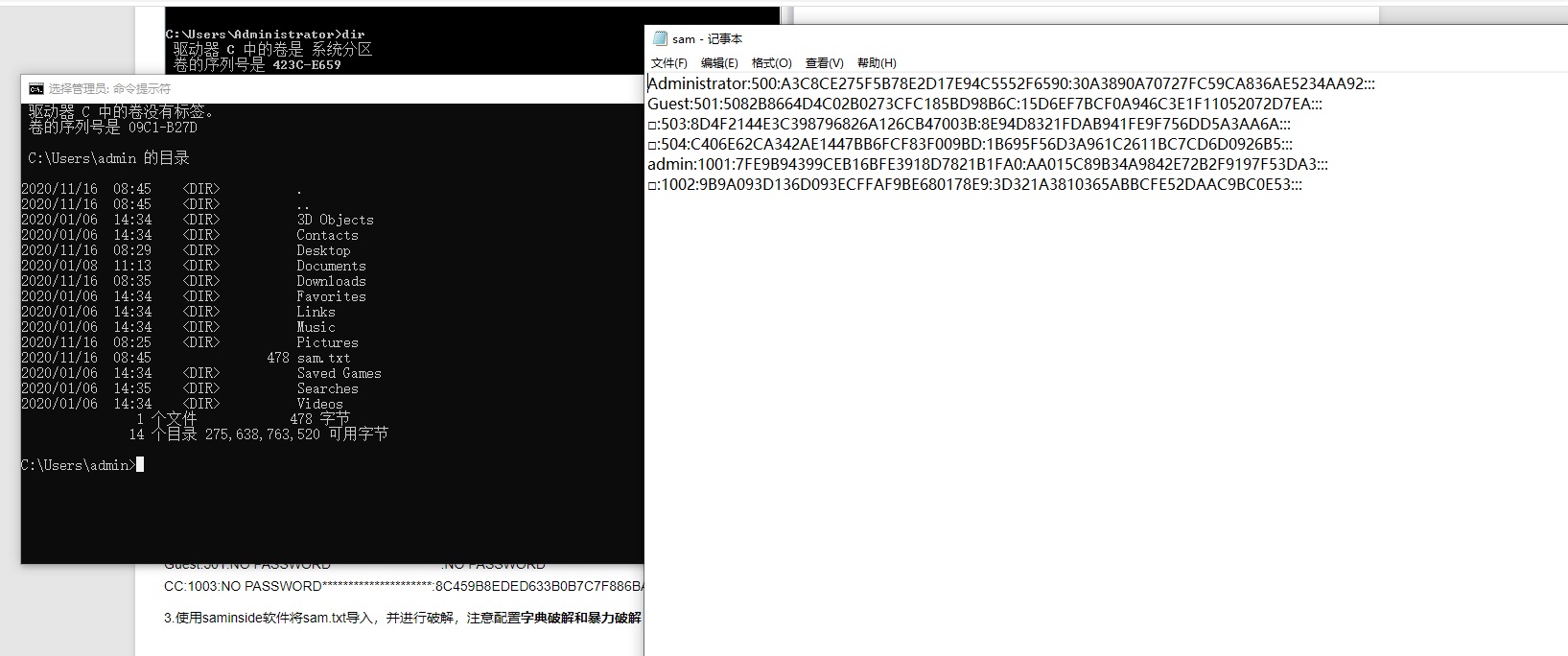 2.使用pwdump软件导出本机的sam文件 sam文件中的新添加账户及其密码的加密后的字符串
