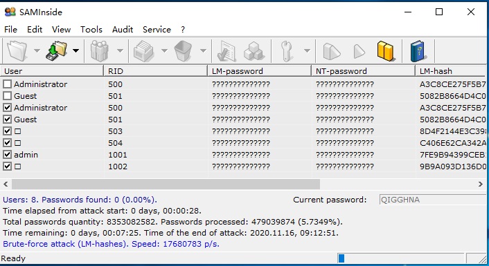3.使用saminside软件将sam.txt导入,并进行破解,注意配置字典破解和暴力破解