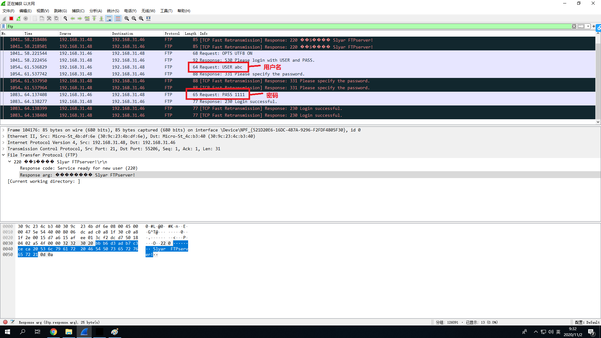 4.B同学停止Wireshark抓包,并和A同学一起分析数据包中的FTP登录过程,还原登录用户名和密码,以及上传文件。