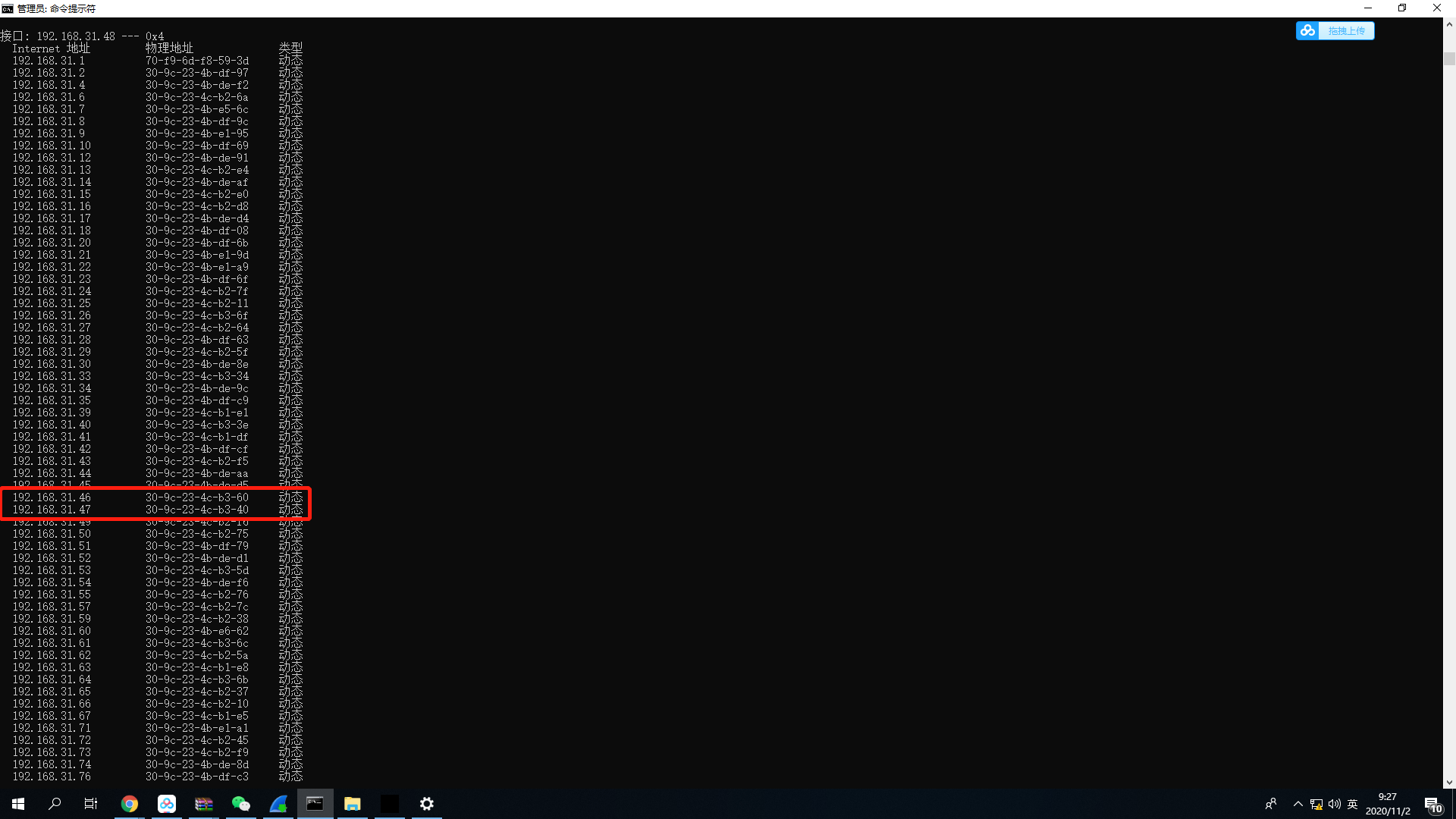 ARP欺骗前192.168.31.46机正常缓存表: