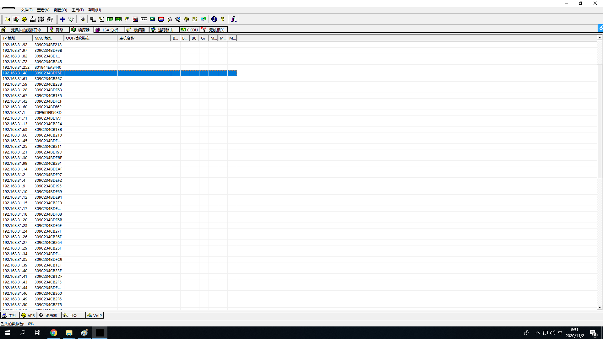 2、在192.168.31.47号机器上运行cain,选择要嗅探的网卡(单网卡,默认就可以)3、点选工具栏中的网卡图标,之后选择sniffer页,再选择左下角的hosts,右键选择“scan MAC address”,扫描局域网中的活动主机IP及MAC地址除网关外,扫描到了攻击目标192.168.31.46和192.168.31.48。 3、选中ARP页-》点下列表栏空白处,大加号变为可选-》点大加号,在弹出的窗口中选择要嗅探的目标主机(注意这里的选择和单击欺骗嗅探不一样,左面直接点网关,其它机器自动出现在右侧列表中,这时需要按住ctrl键在右侧选择你需要嗅探的主机,如图所示)点oK按钮,回到软件主窗体,如图所示(这是欺骗两台机器)4、点击工具栏第三个图标(start ARP)就可以ARP欺骗了。