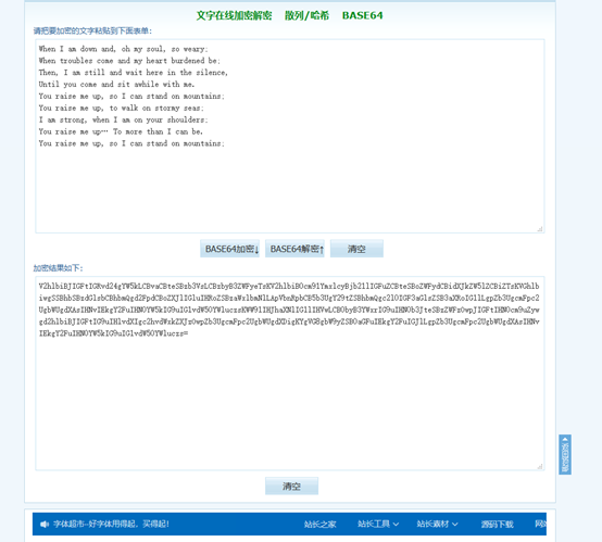V2hlbiBJIGFtIGRvd24gYW5kLCBvaCBteSBzb3VsLCBzbyB3ZWFyeTsKV2hlbiB0cm91YmxlcyBjb21lIGFuZCBteSBoZWFydCBidXJkZW5lZCBiZTsKVGhlbiwgSSBhbSBzdGlsbCBhbmQgd2FpdCBoZXJlIGluIHRoZSBzaWxlbmNlLApVbnRpbCB5b3UgY29tZSBhbmQgc2l0IGF3aGlsZSB3aXRoIG1lLgpZb3UgcmFpc2UgbWUgdXAsIHNvIEkgY2FuIHN0YW5kIG9uIG1vdW50YWluczsKWW91IHJhaXNlIG1lIHVwLCB0byB3YWxrIG9uIHN0b3JteSBzZWFzOwpJIGFtIHN0cm9uZywgd2hlbiBJIGFtIG9uIHlvdXIgc2hvdWxkZXJzOwpZb3UgcmFpc2UgbWUgdXDigKYgVG8gbW9yZSB0aGFuIEkgY2FuIGJlLgpZb3UgcmFpc2UgbWUgdXAsIHNvIEkgY2FuIHN0YW5kIG9uIG1vdW50YWluczs=