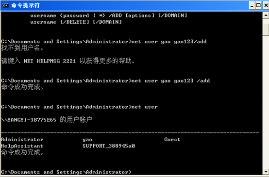 1.在windows xp系统中使用 net user gao gao123 /add添加用户gao,密码gao123的账户(用户名和密码可以自己设定);并使用net user命令确定用户添加成功。