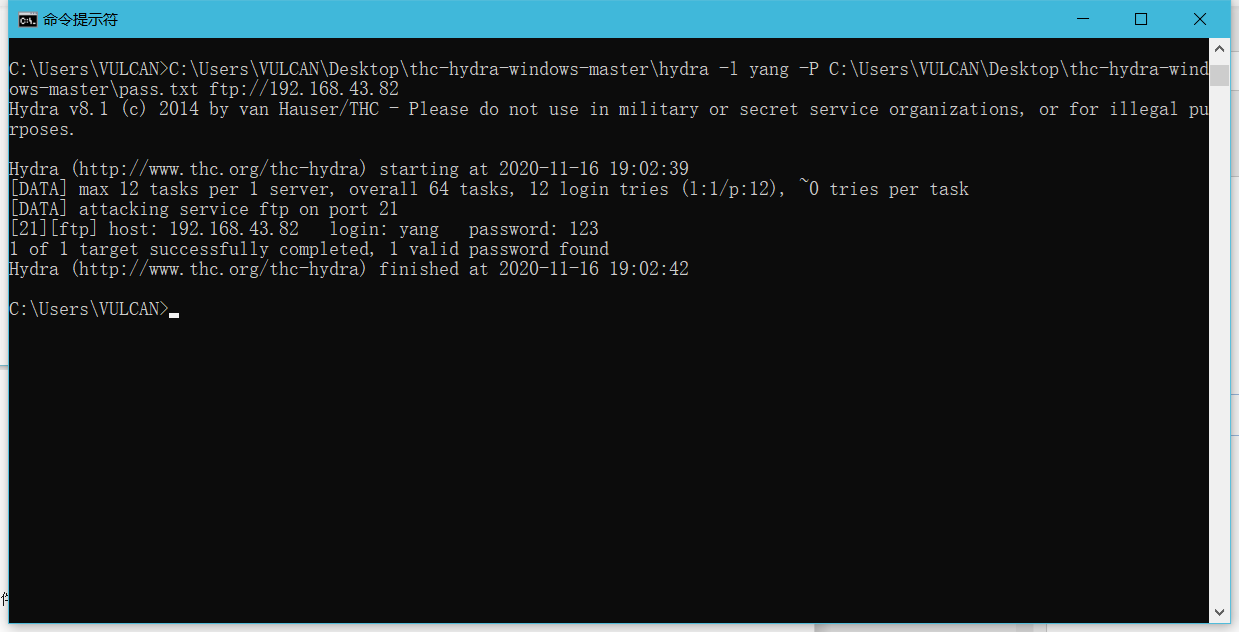 2.B同学使用hydra 对ftp用户的密码进行字典破解。hydra 中有关于该软件的使用命令语法。字典文件需要自己去生成。