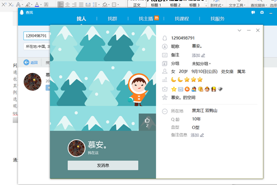 也可以自己选择一个网络虚拟身份(QQ,Mail,Tel),通过互联网搜索获取该虚拟身份的其它相关信息。(请说明推理过程,附搜索截图)