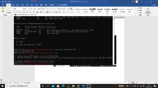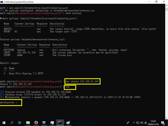 4.把远程目标参数rhosts设置为主机A的IP地址,开始攻击。
