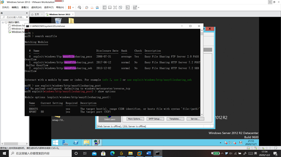 3.进入msf命令行后使用search命令查找相关模块,use 加载模块,show options 查看参数。