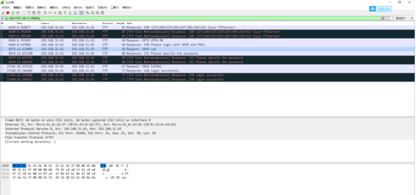 5:C机登录B机的FTP,在A机处攻击后在wireshark中进行捕获B机的FTP登陆用户名和密码