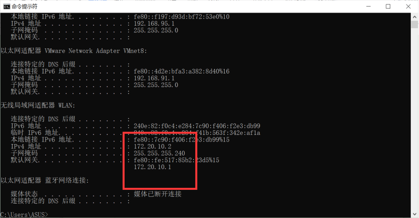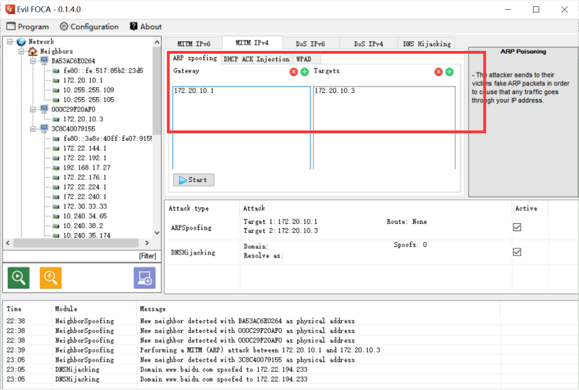 1:搭建实验环境,虚拟机A为被攻击方ip为172.20.10.3,主机B为攻击方ip为172.20.10.2,他们的网关都是172.20.10.1