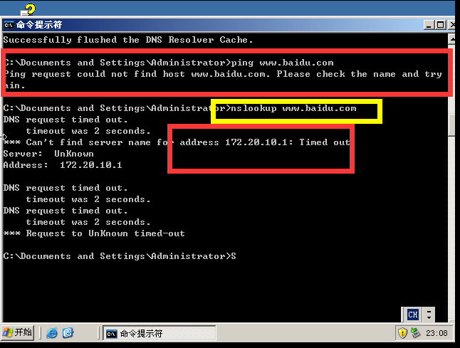 4:攻击之后再在虚拟机上ping www.baidu.com发现ping不通,显示找不到主机,再在虚拟机上查看该网站ip,发现网关已经变为自己所设置的ip