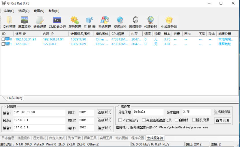 配置好回连IP地址(攻击者IP)和端口号,并点击“生成服务端”按钮,生成木马服务端。将生成的木马保存在指定路径
