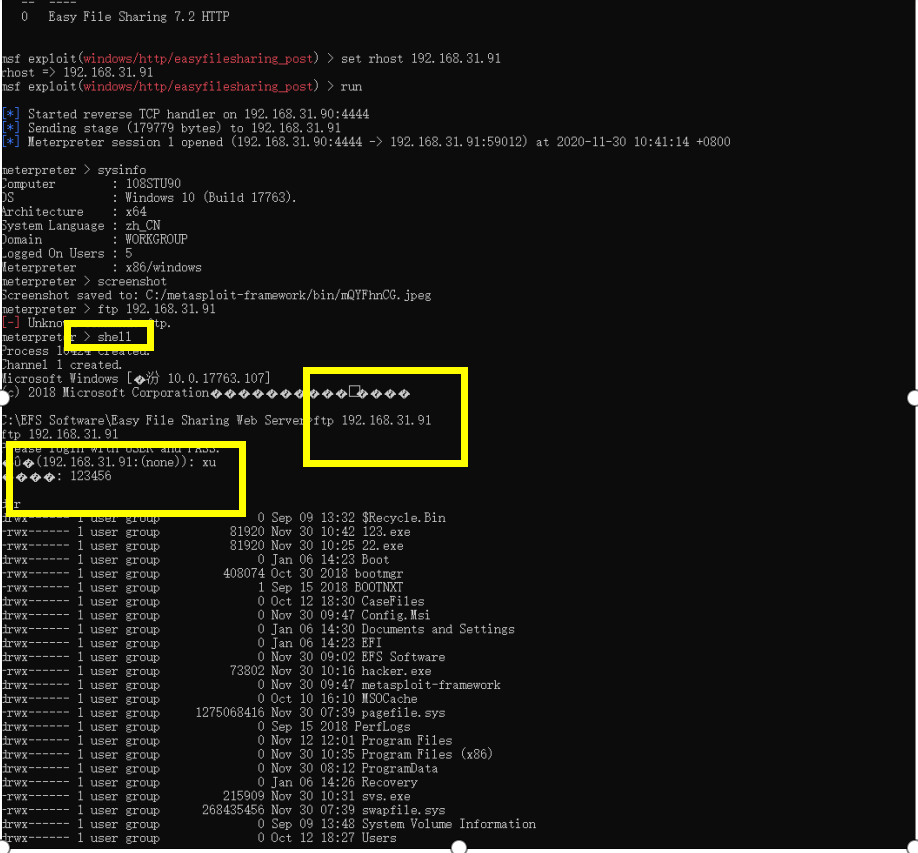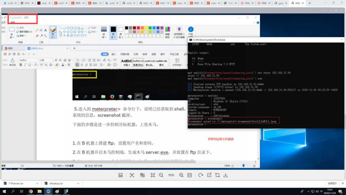 5.进入到meterpreter> 命令行下,说明已经获取到shell,可以使用sysinfo查看目标系统的信息,screenshot截屏。