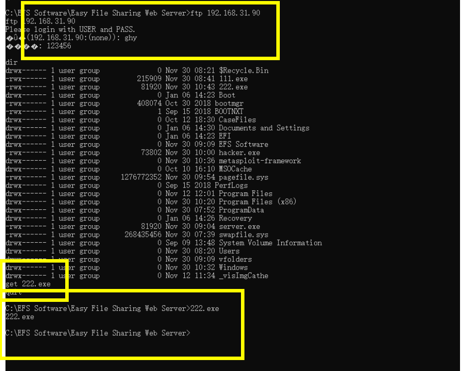4.用被控机器的shell登录B机器的ftp,下载并执行木马。查看木马上线。